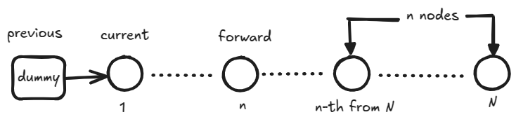 So, we start with a current pointer at the head and a forward pointer at the -th node from the head. We then move both pointers together. When the