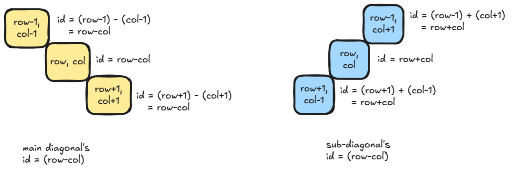 Main diagonals are characterized by and sub-diagonals are characterized by