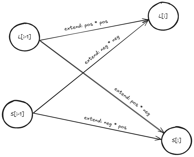 nums[0:i+1] for a subarray that includes nums[i]. Now, we can update to include negative-negative-gives-positive path: