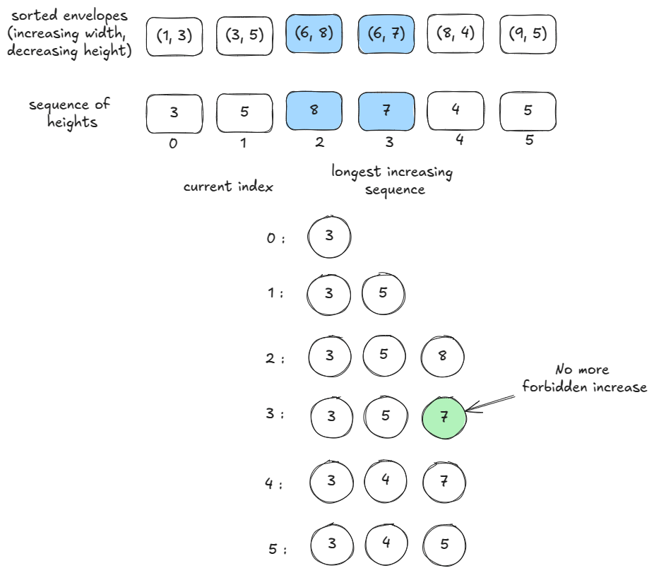 For our problem, we want both height and width to be increasing. If there are multiple envelopes having the same width but different heights, finding the length of the longest increasing sub-sequence considering only heights might overshoot — we may include some heights which are prohibited by width. An example below: