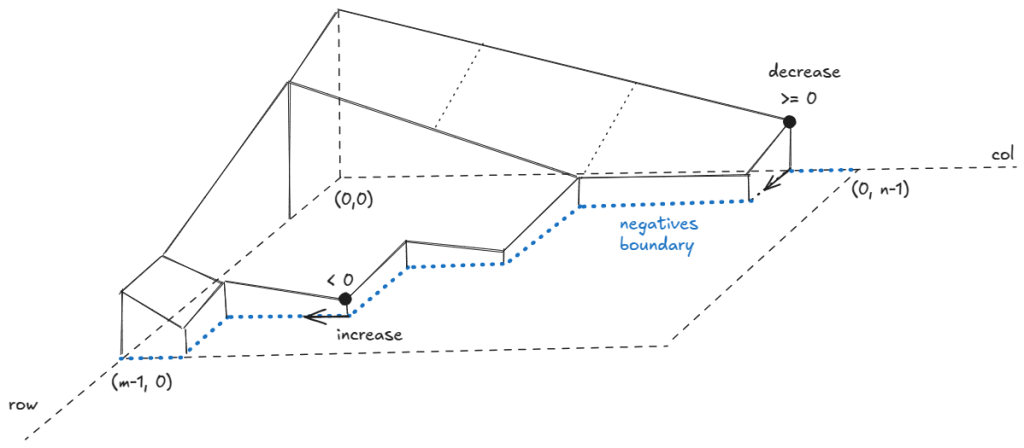 Since the grid is sorted both row-wise and column-wise, at each coordinate we have two directions with “opposite” gradients: one decreasing and one increasing. Using this, starting either from (0, n-1) or (m-1, 0), we can trace the negative boundary and count. If current cell is >= 0, we can follow the decreasing direction. If the cell is < 0, we can follow the increasing direction.