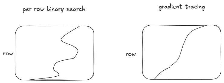 Per row binary search is more generic. Gradient based tracing works when the boundary is monotonic.