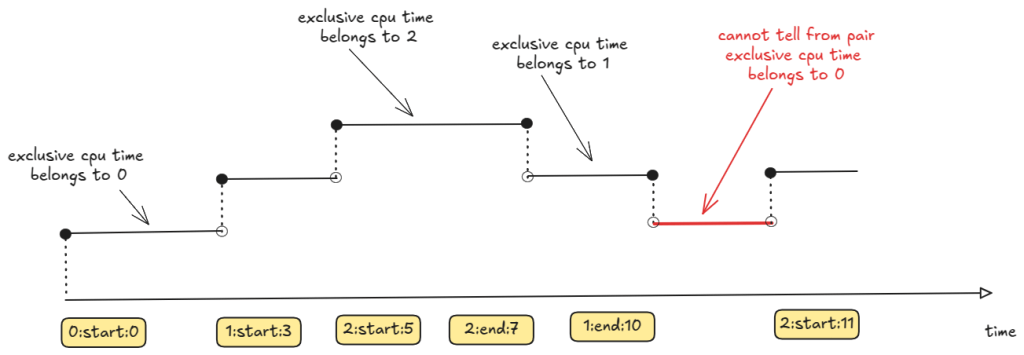 A function call-stack is two-dimensional: it has height (who is active) and width (time). When the call-stack comes back to its previous height, an earlier function resumes and we do not have a log for resume. As a result, just by looking at two consecutive (start/end) logs, we could not tell which function the in-between cpu time should belong to. An example below: