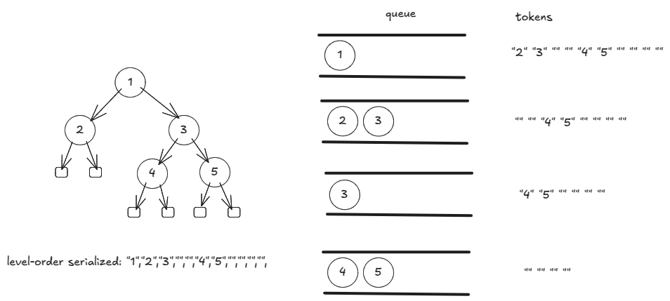 We serialize the tree in pre-order like: . During deserialization, we use a stack to parse nested parentheses or brackets.