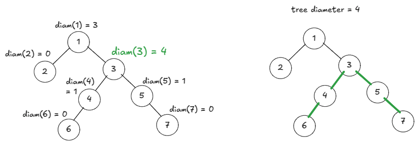 So, we recursively find height of a node and piggyback on that recursion to compute the length of the longest path that goes through the node. Diameter of the tree is then the max such length.