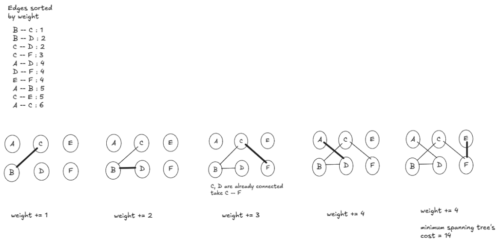 We start with equivalence classes or connected-components and we end up with a single connected component. In the process, we consider edges in non-decreasing order of their weights (lightest to heaviest). We add the edge
