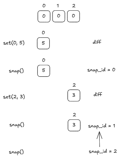 snapshot_id: Initialized with -1. On each snap, increases by 1.diff: A dict: {index -> value}. Captures changes since the lastsnap().snapshots: A dict: {snapshot_id -> diff}. If diff is empty, against the new snapshot_id, we save a reference to the previous snapshot’s diff. Otherwise, a copy of the diff is saved.
