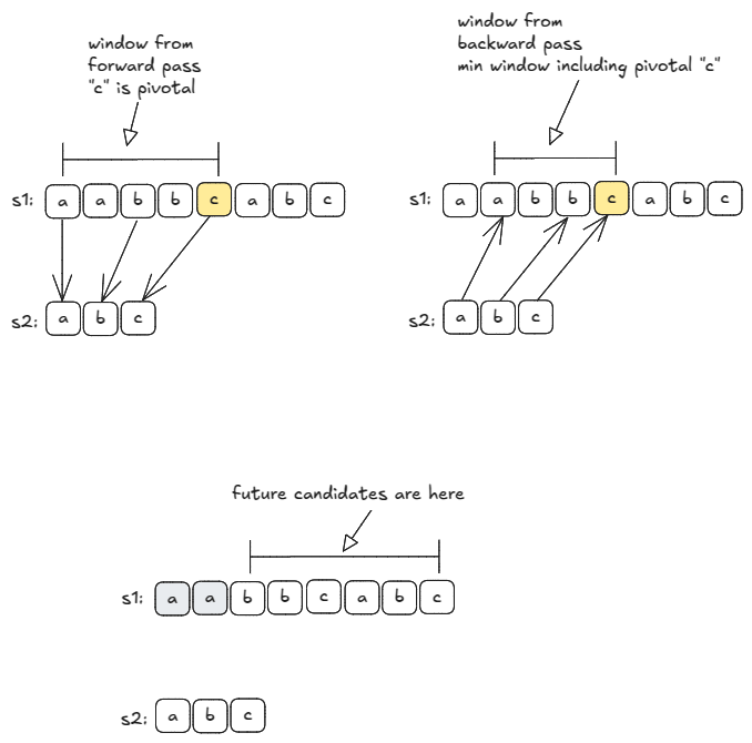 We can expand the sliding window until we find all chars of s2 in order. Then we do a backward scan from the end to find the minimum length window. Now, we can shrink the entire window past the min-window’s first char.