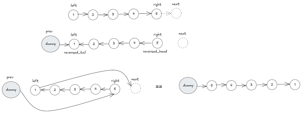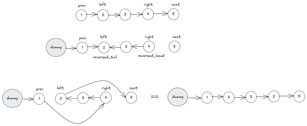 We jump to the left node and reverse (right-left+1) number of nodes. We then fix two pointers: