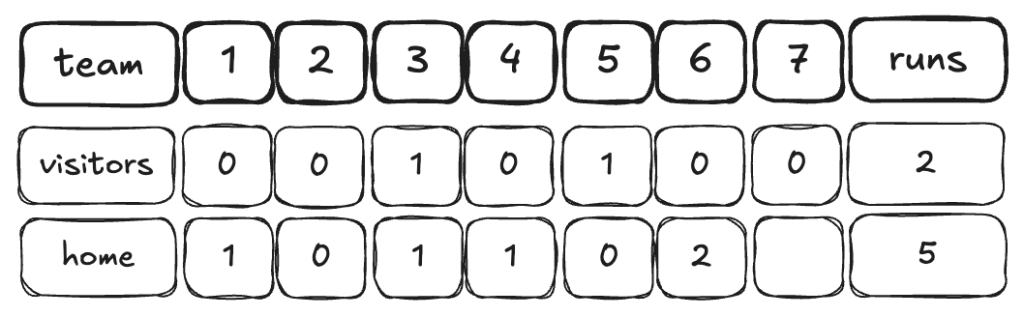 Say there is a baseball game on-going. There are two teams: (1) “visitors” (2) “home”. The game has seven innings. Each inning takes about fifteen minutes to complete. The two teams start with score 0-0. In one inning, the team “visitors” bat first until three outs happen, then the team “home” bat. The scores of the two teams are being kept in a key-value store with just two keys: (1) “visitors” (2) “home” like below: