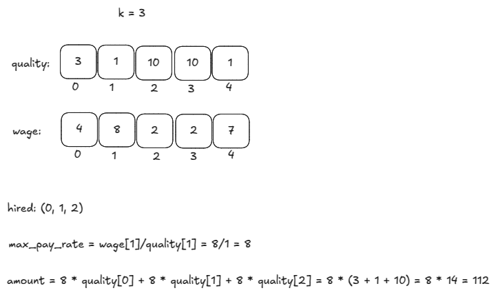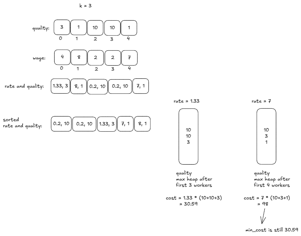 Cost is a product of max-rate and sum-of-qualities. If we did not have max-rate, we could use the k-smallest qualities to form the hired group. Since we need to use max-rate, while finding k-smallest qualities, we process the qualities in non-decreasing order of rates (wage/quality). In that way, if we decide to hire the current worker, we know we need to use that person’s rate as the group rate.